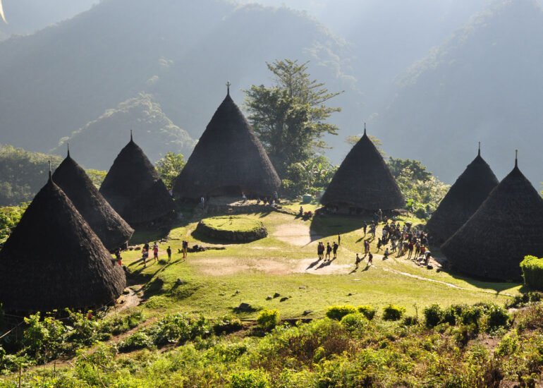 Wae Rebo es famoso por sus tradicionales casas cónicas de madera y paja llamadas «Mbaru Niang». Estas casas, únicas en su diseño, tienen techos altos y puntiagudos que se asemejan a una sombrilla gigante. Cada casa puede albergar a varias familias y se utiliza tanto para vivir como para realizar reuniones comunitarias y ceremonias tradicionales.